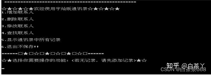 创建一个通讯录系统。假设系统中每个联系人记录只包括姓名,年龄,性别,电话号码,QQ、住址及生日等信息。程序的运行效果如下图所示,选择任意菜单后,实现相应功能。