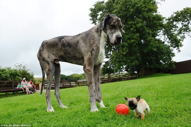 当一只吉娃娃站在一只大型犬边上时是这样的: