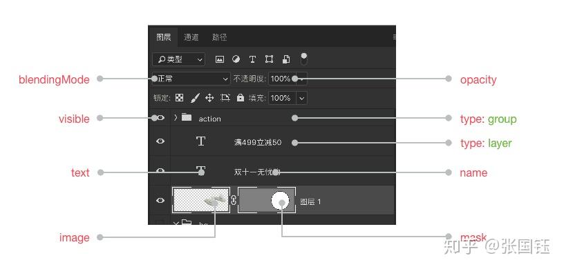 | 字段 | 说明 | | ---- | ---- | | type | 图层类型,group表示分组,layer表示普通图层 | | name | 图层名称 | | visible | 是否可见 | | opacity | 透明层,0~1 | | blendingMode | 图层模式 | | width/height | 图层内容的宽和高 | | top/bottom/left/top | 图层内容相对文档的范围区域 | | mask | 蒙层路径信息 | | image | 图层图像信息 |