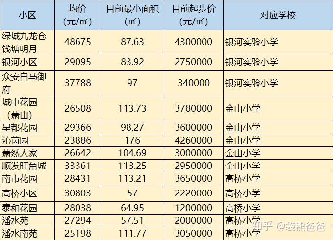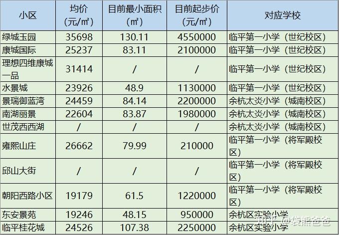 余杭部分学区价格和面积: