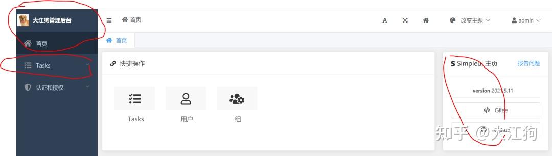 现在你可以看到语言、logo和管理后台名字都已经改过来了。但是你会发现两个问题,左侧菜单的tasks显示的依然是英文,我们需要将其设置成中文。另外,右侧有simpleui的广告链接,页面背后有js文件跟踪simpleui的使用,这些都需要关闭。我们接下来教你如何解决这两个问题。