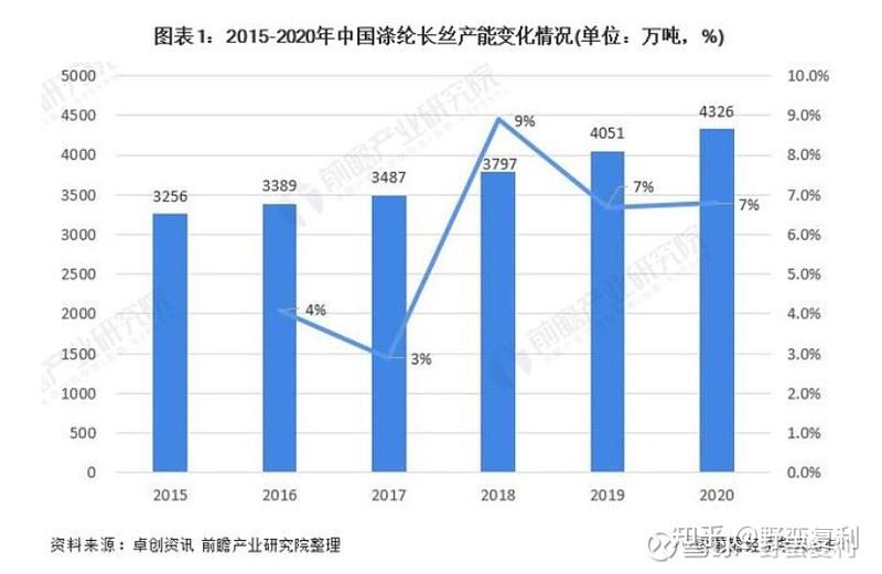 2015-2020年,涤纶长丝产能逐年增长,总产能达4326万吨,同比增长7%。2020年,涤纶长丝行业产能增加275万吨,其中新增产能为 恒力石化 40万吨、 恒逸石化 75万吨、 新凤鸣 60万吨、 东方盛虹 20万吨、福建百宏的25万吨、 桐昆股份 的30万吨以及嘉兴逸鹏的25万吨。
