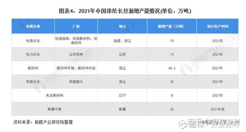 从新增产能来看,2021年我国涤纶长丝新增产能预计为181.5万吨,较2020年新增产能有所减少。其中,东南沿海地区新增产能最多,预计为153.5万吨,包括 恒逸石化 在福建和浙江的70万吨产能, 恒力石化 在江苏的15万吨产能,以及 新凤鸣 和 荣盛石化 在浙江的68.5万吨产能。