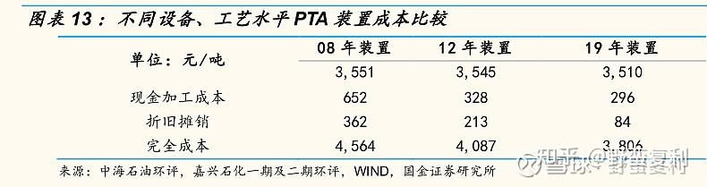 PTA 先进设备、工艺成本优势超 700 元/ 吨。与 PX环节主要依靠规模化获得成本优势不同的是,PTA 设备工艺的迭代总能带来可观成本优势,刺激企业投放先进产能。我们测算显示,应用最新设备、工艺的 PTA 装置(2018 年水平)完全成本较一般装置(2012 年水平)低 281 元/吨,较落后、老旧装置