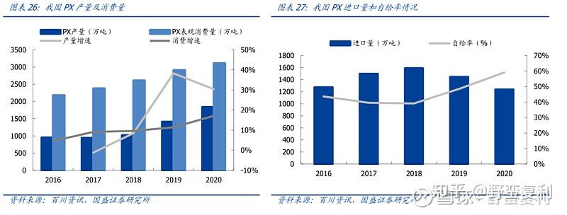 2020 年国内 PX 表观消费量 3393 万吨同比 16.64%,国内 PX 产量 2007 万吨,同比42.25%,PX 自给率从 2016 年的 44%逐步提升至 2020 年的 59%,目前 PX 行业供应缺口 1386 万吨。