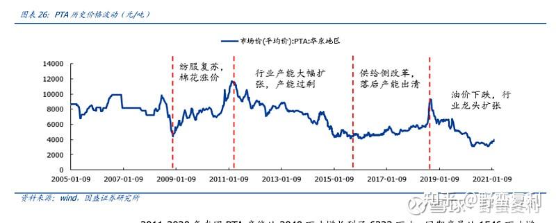的发展历程,行业大致经历了四轮景气周期:1)2011 年之前随着聚酯产业向国内转移,上游 PTA 供应紧张,进口依赖度高达 50%,行业盈利较好,2010 年受棉花价格上涨影响,聚酯需求增加,带动 PTA 价格上涨,致使 2010-2011 年 PTA 的盈利达到近 20 多年来的高点,刺激我国开始了新一轮的产能扩张,很多公司纷纷上马 PTA 产能。2)2011年是一个重要的转折点,在随后的 2011-2015 年,我国迎来了 PTA 投产的高峰,进口依赖度大幅下降,行业产能逐渐过剩,产品价格进入下行周期;3)2016-2019 年的行业供给侧改革及环保升级,使得 PTA 行业落后产能逐渐停产或退出,PTA 价格重回 8000 元/吨以上的高盈利周期;4)2019 年以来国际油价下跌,同时