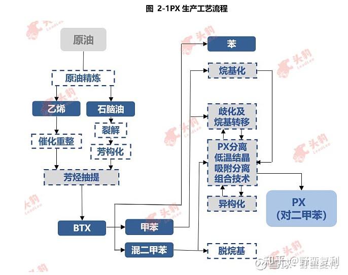 PX主要来自于原油炼制过程,经石脑油催化重整或乙烯裂解芳构化合物的循环反应进行制取,生产流程如下图所示: