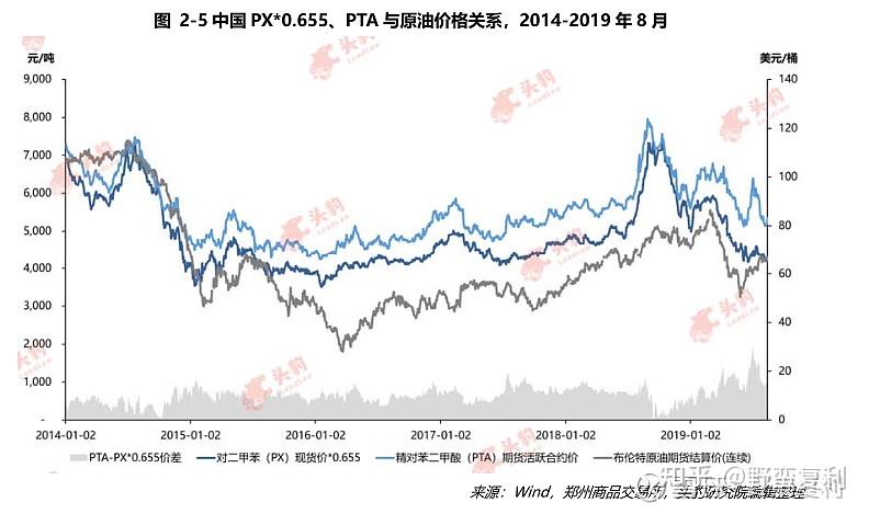 成本分析:一般来说,制造 1 吨涤纶需要 0.855 吨 PTA 和 0.335 吨MEG。而 PTA 由 PX(对二甲苯)氧化而成,1 吨 PTA 中需要约 0.655 吨 PX。PX来自石脑油,石脑油的源头则是石油。