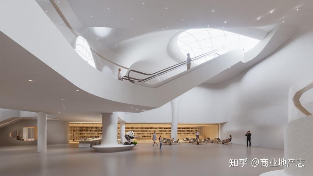 这片区域搭载了 通高展厅 、 快闪艺术展览区 、 休闲书吧 等多个功能区,层高较高区域凝聚气势、低层窄区营造温馨氛围。未来这里也将用以举办艺术空间、文创书吧、文创市集等特色艺术文创活动以及作为公共休闲场所来使用。