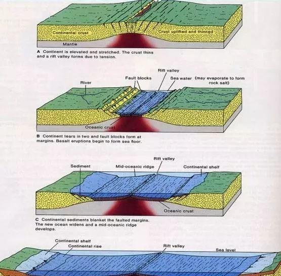 大陆继续被拉张,岩石圈进一步变薄,地幔物质大规模上涌,原先的大陆裂谷变成海湾式的狭窄洋盆,其现代的代表为红海和亚丁湾。