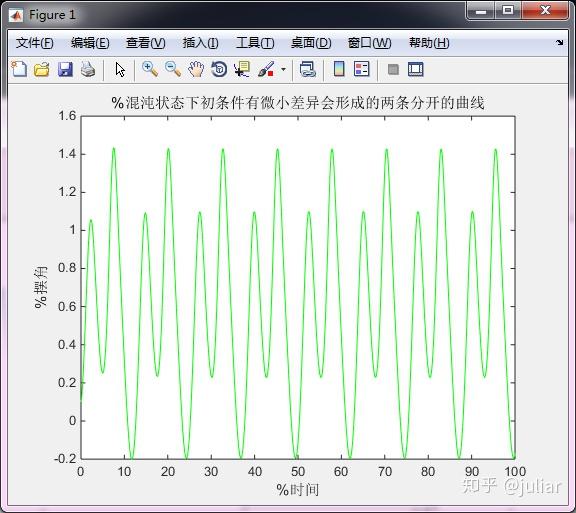 [T,Y]=ode45(@dby,[0:ZQ/100:30*ZQ],[-0.8,2]);%解方程 在一个周期ZQ中取100个点