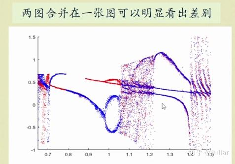 当 f=1.03 ,从不同的初始条件出发,得到不同的蛋形的吸引子,它们左右反射对称,原来的左右对称性被破坏。(上下分别是:相图、庞加莱截面图)