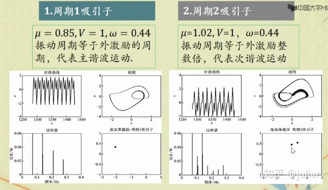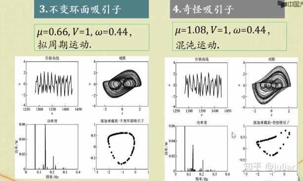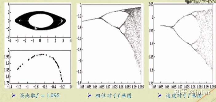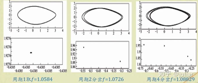 如果给出合适的驱动力和初始条件,以上方程会出现周期分叉现象,周期运动。混沌运动。为了能观察这种复杂的现象,我们要学会做 庞加莱截面 。