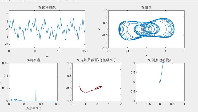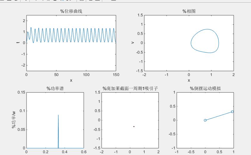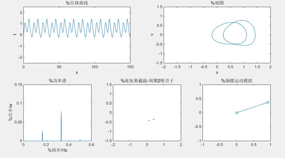 得到在周期为2的驱动力下的相图和庞加莱截面图如下:(也可以通过取不同的f,得到其他周期的图)