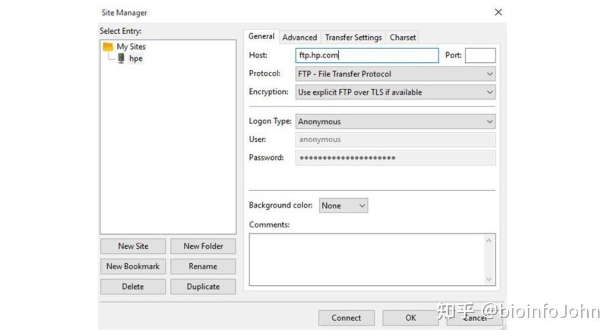 运行 FileZilla 并创建到 FTP 主机的新连接(文件 > 站点管理器 > 新站点)。指定要连接的 FTP 服务器(主机)名称和凭据(或使用匿名登录类型)。