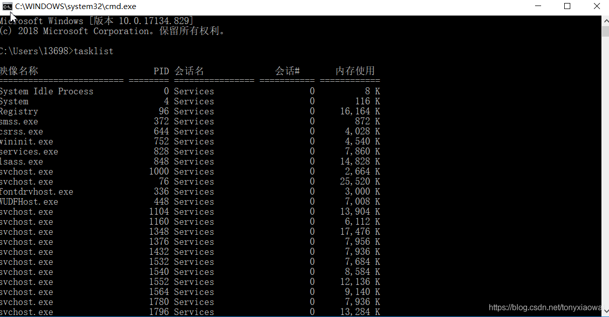 这里我们用到了两个,一个是tasklist,该命令是列出当前在运行的程序,就是打开任务管理器,看到的当前进程列表