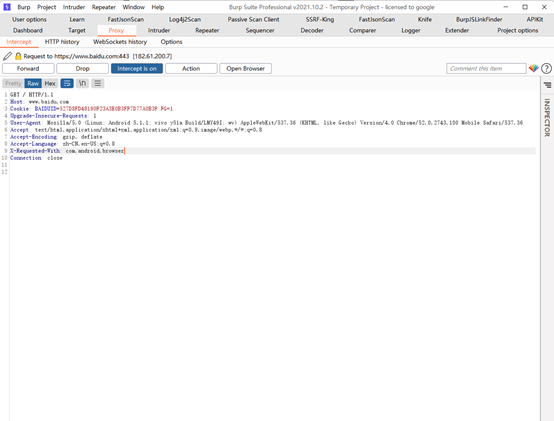 二话不说,挂代理开搞,不出所料,抓不到包,尝试浏览器走个百度的流量,可以正常抓到。