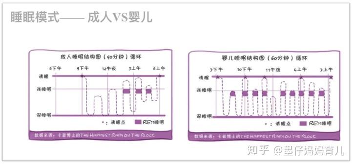 - 婴幼儿的睡眠周期比成人短,大概在60分钟左右,所以,在同样的漫长深夜中,婴幼儿的睡眠周期数量就比成人多,而每个睡眠周期又是由快速眼动睡眠(REM)和非快速眼动睡眠(NREM)交替组成的,在浅睡眠和深睡眠中来回切换。
