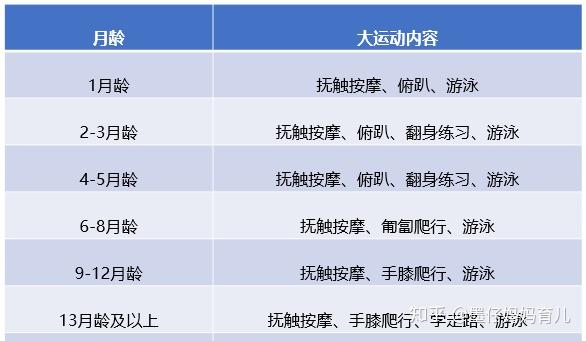 当宝宝到了一定的月龄阶段,就需要在家长的帮助下练习新技能,这期间,家长就需要制定好计划,有针对性的不间断的训练,下表中标注了不同月龄宝宝每日所需的大运动类型,虽然抚触按摩从真正意义上不算大运动,但是却是放松肌肉的好方法,只运动不按摩会造成宝宝肌肉紧张。