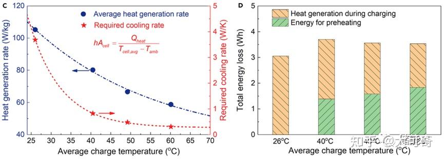 下图A是PHEV电池分别在不加热,以及加热平均温度为40℃、49℃和60℃下,CCCV(6C,4.2V)的电压曲线图,图B是为了在充电过程中达到相对恒定的温度所采用的降温策略。可以看出,即便使用风扇对电池施加强气流,电池的温度依然升高10℃以上。有趣的是,随着充电温度的升高,对冷却的需求却大大减少。图C红线可以看出,4块PHEV电池的 冷却需求随平均充电温度的升高呈指数衰减 。造成该现象的原因有二:其一,电池随着温度的提升,电池内阻下降,产热率随之大幅降低(图C蓝线);其二,电池与环境的温差随温度的提升而增大,因此整体降温需求也随之减少。此外,在高温充电时,充电时产生的热量减少,部分补偿了充电前电池预热的能耗,如下图D所示。