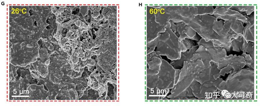 随着电池温度的升高,循环寿命显著提高(如上图B),这主要是由于析锂得到了缓减。为了证实这一点,作者拍摄了4块老化电池的石墨负极的光学照片和扫描电子显微镜(SEM)图像,下图G和H分别为26℃和60℃下的图像,可以看出26℃下的电池正极表面有大面积的颗粒覆盖,而60℃下的正极表面则很光滑,只有少量的颗粒。