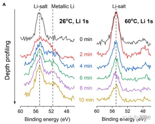 为了进一步确认常温电池中Li金属的存在以及60℃中析锂的消失,作者利用x射线光电子能谱(XPS)对电池进行测试,结果如下图所示。从上到下的曲线为基于SiO2,溅射速率为30 nm/min,溅射0、2、4、6、8和10 min后的Li 1s光谱。两种情况的顶部曲线在约55eV处有一个峰值,这与Li盐有关,表明顶部表面被SEI覆盖。从第二条曲线开始,26℃电池在约51.5 eV处出现了新的峰值,对应金属Li的出现,而60℃电池则没有出现新的峰值。