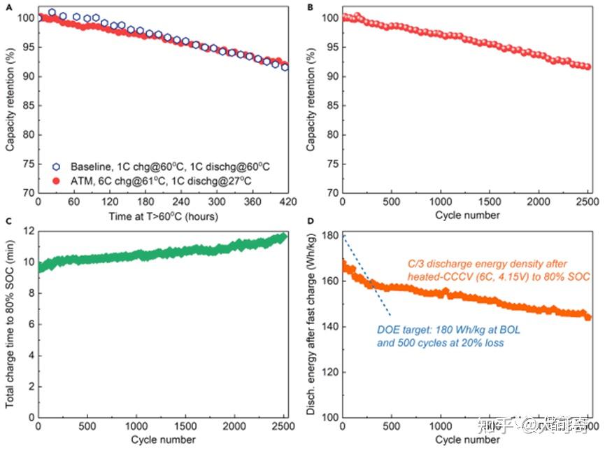 能否在10分钟内增加200英里续航里程,也称之为极速快充(extreme fast charging,XFC),是主流大众是否接受纯电动汽车的关键。 宾夕法尼亚州立大学学者提出一种非对称温度调制(asymmetric temperature modulation,ATM)方法 , 将锂离子电池快速加热到60℃的高温下进行充电,以消除析锂;同时限制电池暴露在60℃的时间不超过10分钟,以防止严重的固体电解质界面膜(SEI)生长 。充电和放电温度的不对称为提高充电过程的动力学和传输性能并实现电池长寿命开辟了一条新的途径。实验结果表明,采用ATM方法,一个9.5 Ah 170-Wh/kg的电池在持续1700个XFC循环后容量损失为20%,而更高能(209 Wh/kg)的BEV电池在2500个XFC循环后,容量保持为91.7% (如下图所示)。