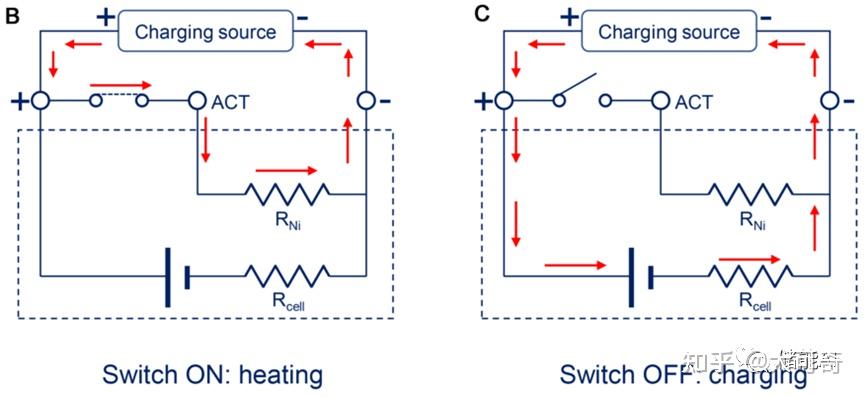 为了将电池快充时间控制在10分钟左右,电池加热速度是一个关键因素。传统的外部加热法温升速率基本小于1℃/min,意味着光给电池加热的时间就要超过10分钟。为此,作者采用了该团队4年前提出的一种可自加热的全气候锂离子电池( 冬奥助力(第一篇):低温下可自加热的锂离子电池——全气候电池 ),该电池能够在极短的时间内将电池温度升高(工作原理如下图)。