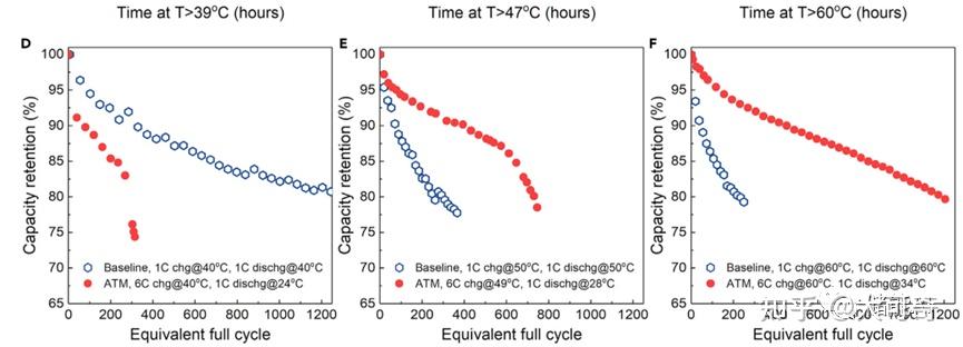 下图D-F比较了ATM和基准电池在不同温度下,基于等效全区间循环(equivalent full cycle,EFC)的CR曲线。从图F可以看出,在60℃时,1C充放电仅在250次循环后,容量损失就达到了20%,相比之下, ATM电池6C充电过程却能够进行1200次循环,表明其优越的循环性能 。实际上,ATM方法每次循环只将电池暴露在高温下10分钟,或7天/1000个循环。根据美国人平均每年行驶13476英里的统计数据,假设一次快速充电可以增加200英里的行驶距离,那么1000次循环就相当于20万英里的行驶距离,也就是14.8年的运行时间。换句话说, ATM方法将BEV暴露在高温下的时间只有其寿命的0.1%(14.8年中的7天) 。