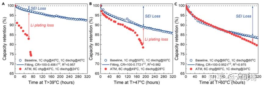 为了进一步了解温度对析锂和SEI生长之间的相互作用,作者尝试分解XFC循环期间的容量损失。作者将基于ATM方法的XFC循环下的3个PHEV电池(记为ATM电池)与3个常规循环的相同类型电池(1C充电1C放电,记为基准电池) 在不同温度(40℃, 50℃和60℃)下进行比较。很多研究表明,SEI在特定温度下的生长主要依赖于时间因素,利用这种依赖关系可以拟合出电池的容量保持(CR)曲线。更有Dahn等人的研究表明,如果SEI的生长是主要的老化机制,那么在相同的温度下,电池的CR时间曲线将与循环速率无关,曲线的偏差表明的是析锂情况。基于该原则,作者比较了ATM和基准电池的时域CR图(下图A-C)。从图C中可以看到,在60℃下的前160个小时的循环过程中, ATM和基准电池的CR曲线基本重合,意味着在60℃下6C充电没有出现析锂 。随着充电温度的降低(下图A和B), ATM电池的CR下降速度比基准电池快得多,反映了在较低的充电温度下析锂更加严重。根据Dahn等人的研究,在这些数据中,每个基线电池的容量损失都可以被视为在特定温度下SEI诱导的损失,ATM和基线电池的差异反映了析锂诱导的损失。