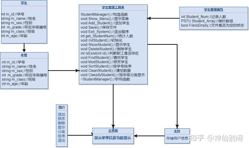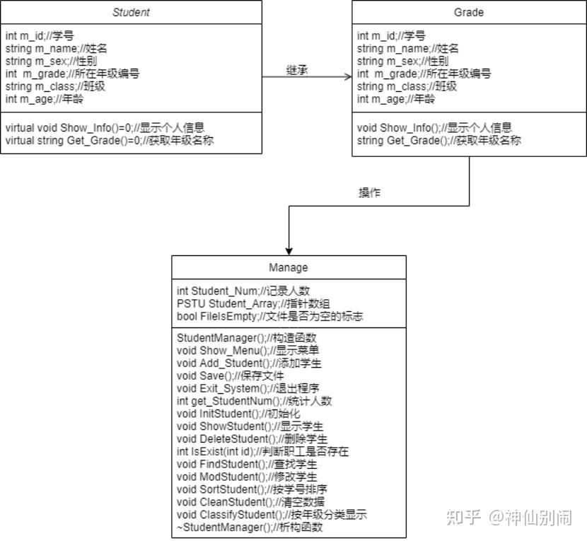 (1)将管理操作类封装:对信息操作的函数、记录学生人数的变量、存储学生信息的指针数组进行封装。类内成员包括:记录人数的变量、学生的指针数组,构造函数、显示菜单、添加学生、退出程序、保存文件、文件是否为空的标志、统计人数、初始化、显示学生、删除学生、判断学生是否存在、查找学生、修改学生、按学号排序、清空数据、按年级分类显示、析构函数 。