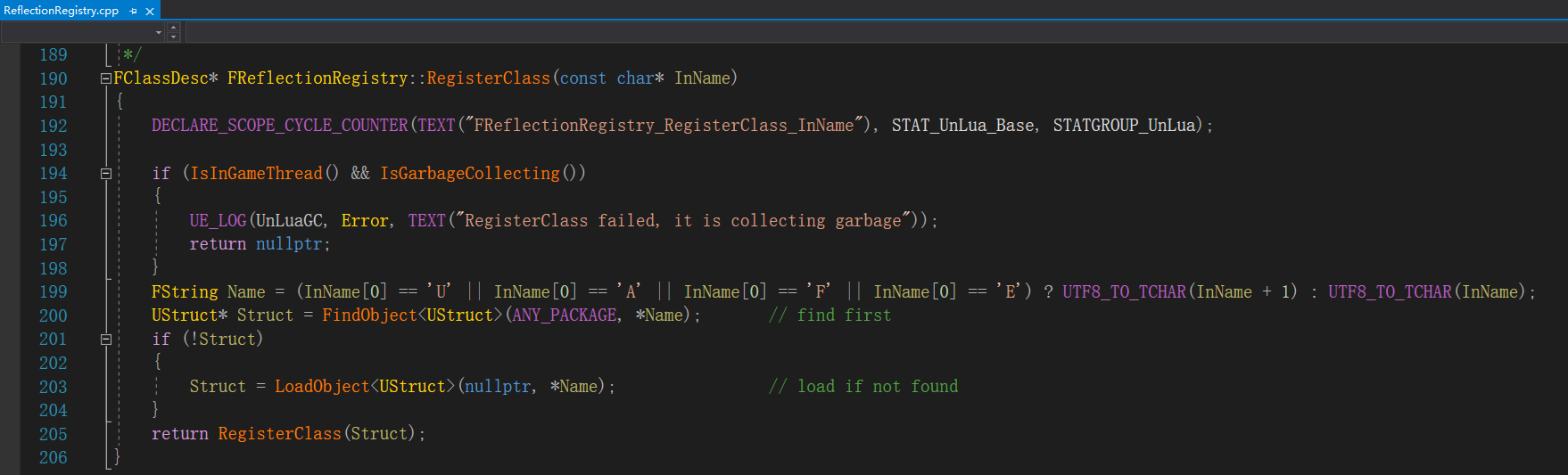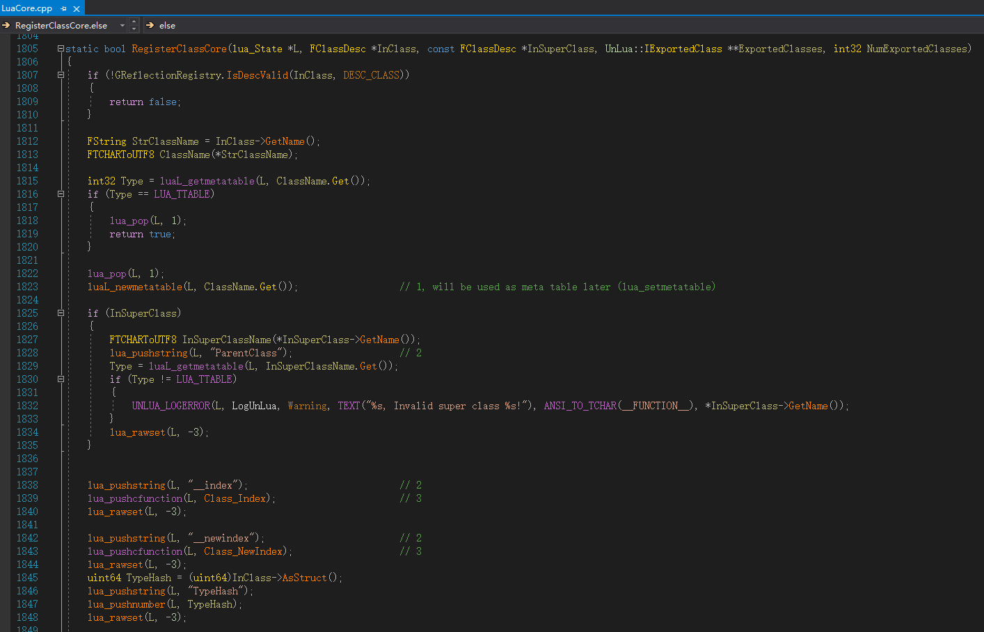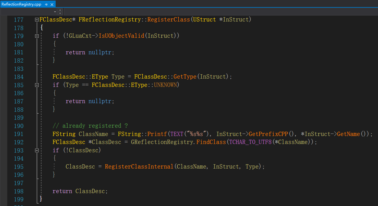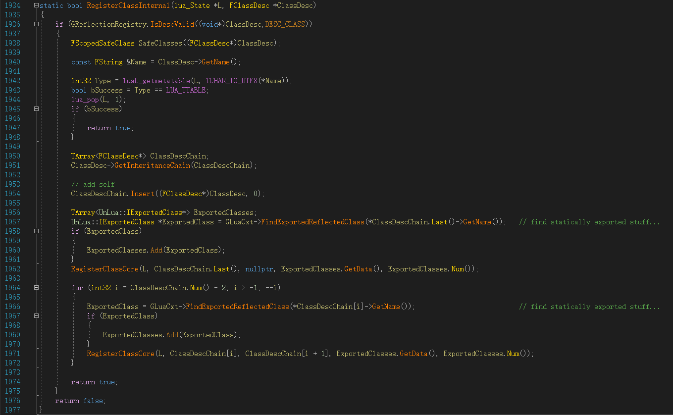 在Lua中访问C++类型的第一步就是注册FClassDesc,将访问的UClass类型包装成FClassDesc,这是UnLua用到的UObject对象类型核心反射数据,然后存储到UnLua的存储全局反射数据的GReflectionRegistry对象中。