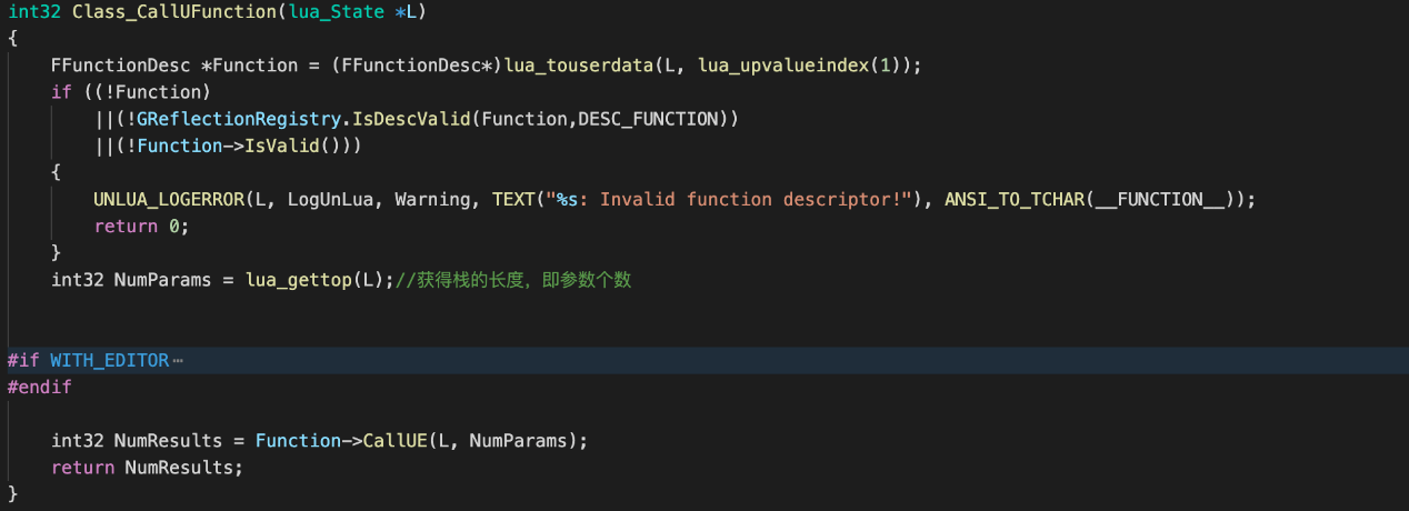 我们已经知道UObject对象类型中的函数在Lua中是一个lua closure,它是C++函数Class_CallUFunction与成员函数的反射信息FFunctionDesc组成的,所以在Lua中调用UObject类型成员函数就相当于调用这个lua closure,最终会转发调用Class_CallUFunction。