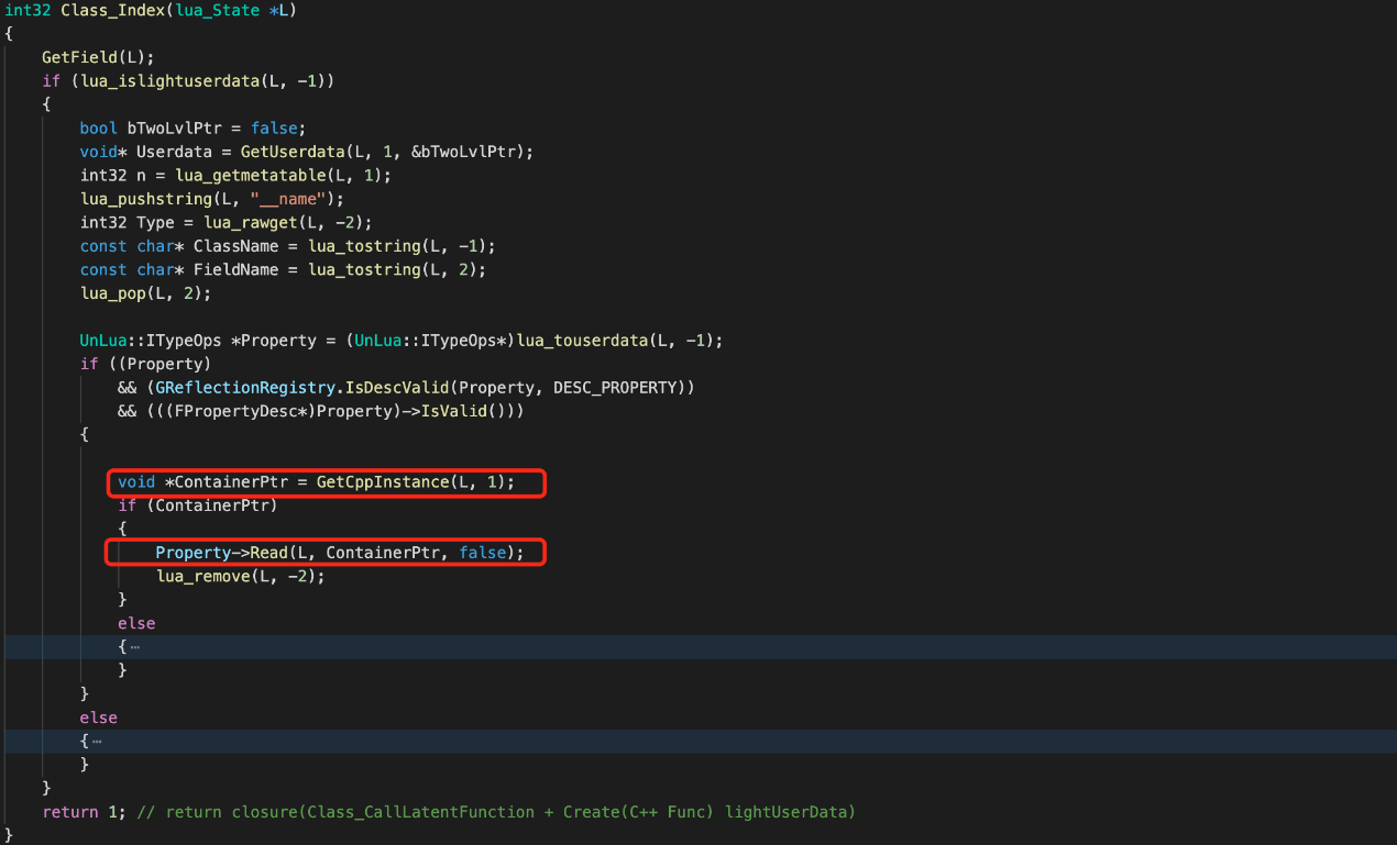 我们知道Lua中的UObject对象实例是一个userdata绑定了metatable,所以对其属性的访问读写,都通过元方法来完成,读取数据都通过Class_Index完成,写数据通过Class_NewIndex完成,这里只记录读取数据,写数据与读数据大同小异。