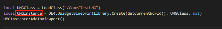 示例中,使用Lua根据一个UMG BP资源路径,创建了一个UMG实例UMGInstance,然后将该UMG添加到视口中。