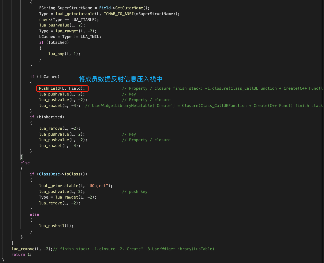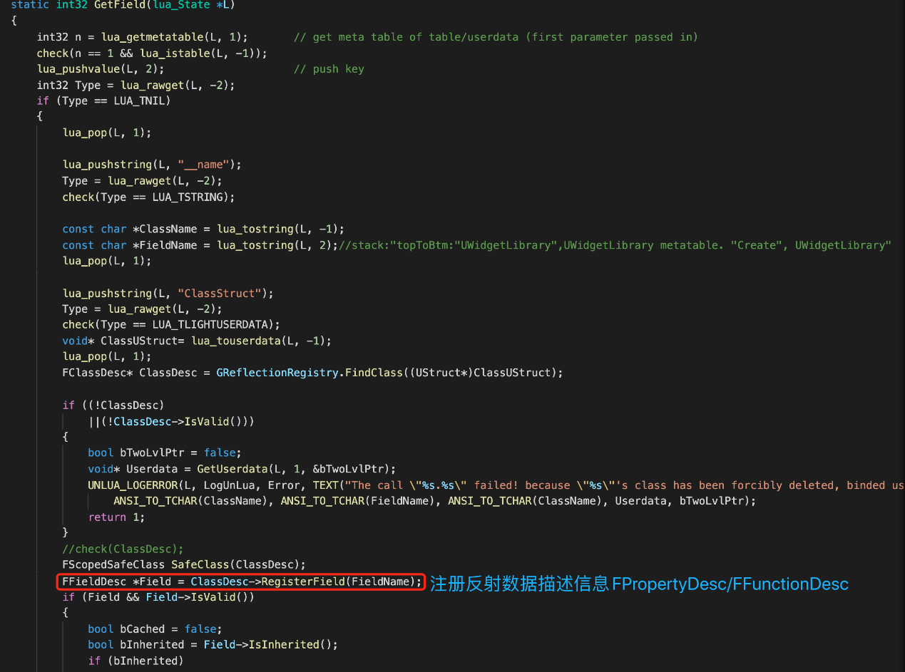 首先转发调用GetFiled,在第2节详细讲述过GetField主要目的是将成员属性/函数的反射描述信息压入栈中,对于成员属性,压入的就是FPropertyDesc描述数据,该数据包含访问成员属性的反射信息。