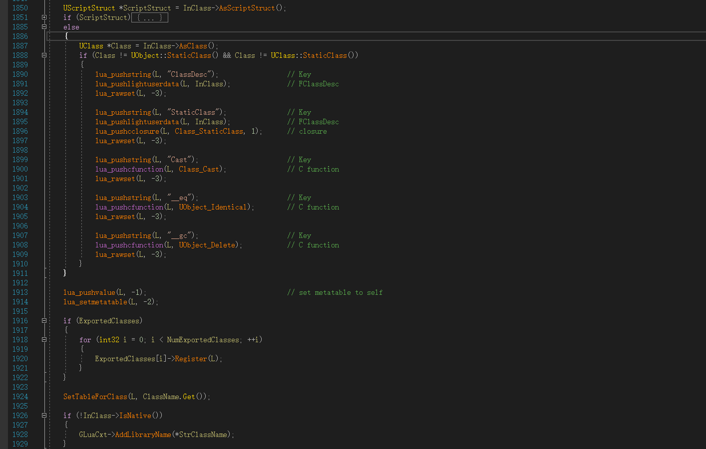 根据该UObject对象类型的继承链,将自身以及父类所有对应的FClassDesc加入到一个列表中,然后递归去为自身以及父类创建metatable,这里注意顺序,会先注册父类,后注册子类确保注册子类metatable关联父类时,父类已经有了metatable。这段代码中还涉及到C++类型的静态注册,后面会详细介绍。Metatable注册入口:
