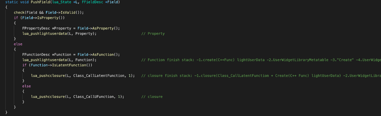 注册成员反射描述信息后,我们已经有了对应成员名的反射数据FFunctionDesc/FPropertyDesc,这样我们无论是访问成员变量还是函数都方便了许多,先将反射数据压入栈中,函数入口: