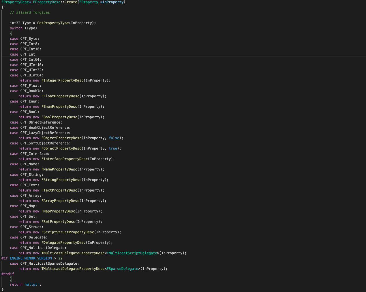 FPopertyDesc的注册: FPropertyDesc是对反射数据FProperty的封装,FPropertyDesc::Create会根据FProperty表示的变量类型来创建对应的描述类型,主要是对FProperty指针以及一系列操作函数进行封装处理,最后存放到所属类型的FClassDesc的Properties中,如图: