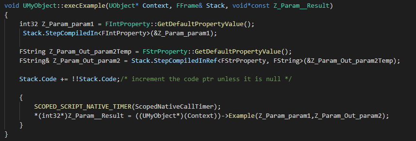 这就是反射调用C++ Native函数的辅助函数,我们可以看到,UHT生成的辅助代码用exec作为前缀,将我们实际的C++ Native函数Example进行了封装,使用了统一的函数参数,可以方便反射调用,Context就是UObject对象实例,对于静态函数,这个参数并没有用处。Stack参数是FFrame结构,该结构可以理解为反射函数一次调用所需要的上下文环境,所有执行调用工作依赖的数据都存储在这个结构中,包括UFunction,函数参数内存块,函数参数反射信息等。根据这个结构可以准确的获取到每个函数的传入参数的数值,以及引用参数的传出。Z_Param__Result参数是返回值地址,C++ Native函数返回值写到该地址中。