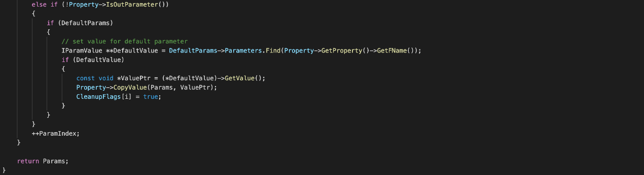 然后遍历FFunctionDesc的参数列表Properties,会依赖每个参数的FProperty将Params内存块中每个参数初始化,然后将Lua栈中的函数参数逐个取出并拷贝到Params内存块中,填充Params内存,如果Lua传入的函数参数数量小于UFunction的参数个数,可能是该C++函数有默认函数,Lua传参时使用C++默认函数,这时就需要去FFunctionDesc构造时传入的默认参数数据中查找,如果有就继续填充Params内存,没有就说明Lua传入参数错误。