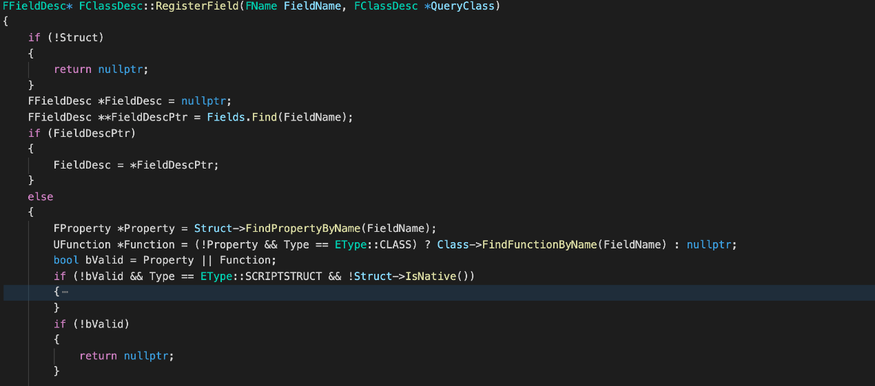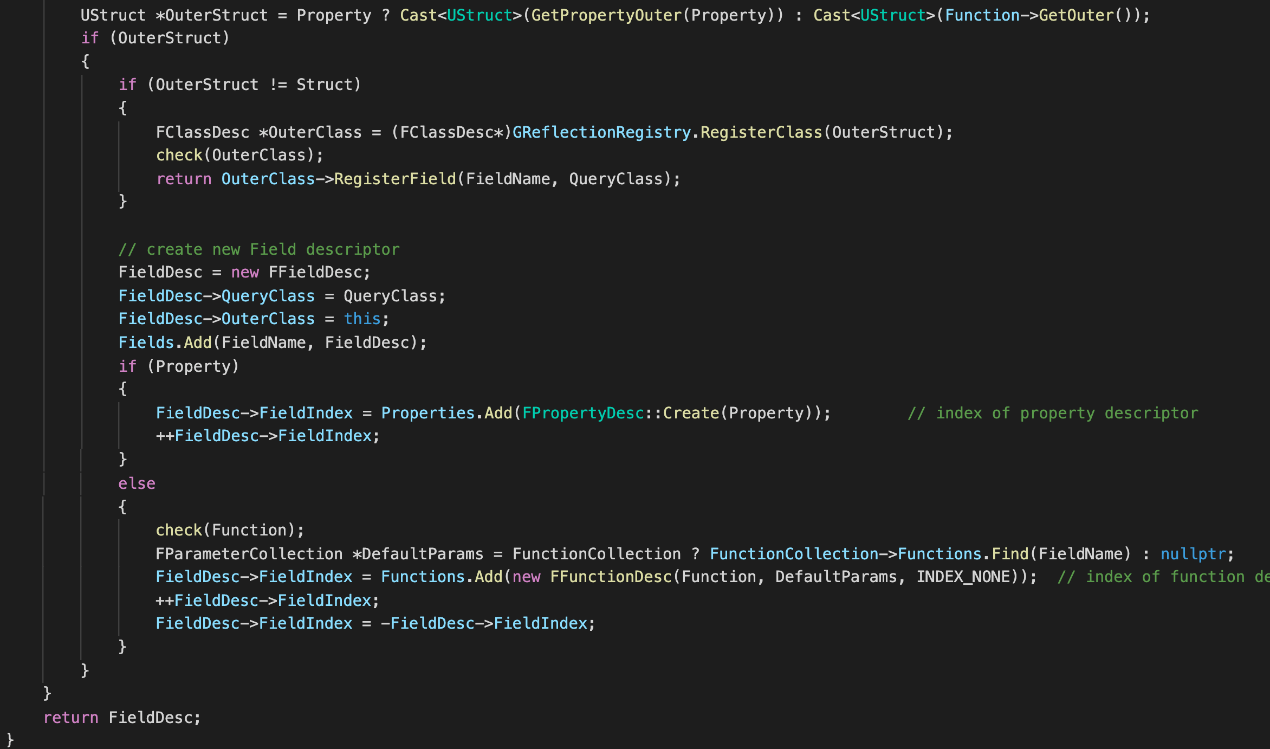 如果找到了对应成员名的FProerpty或UFunction,那么需要根据它们的outer(也就是属性或者函数所在的类型)去注册成员描述信息FFieldDesc,以及反射数据描述信息FPropertyDesc/FFunctionDesc。这里需要注意,如果访问类型的UStruct与找到的属性Outer的UStruct不是同一个,那就说明访问的成员是基类的成员,那么需要在基类中注册成员的描述信息,不在当前类注册。