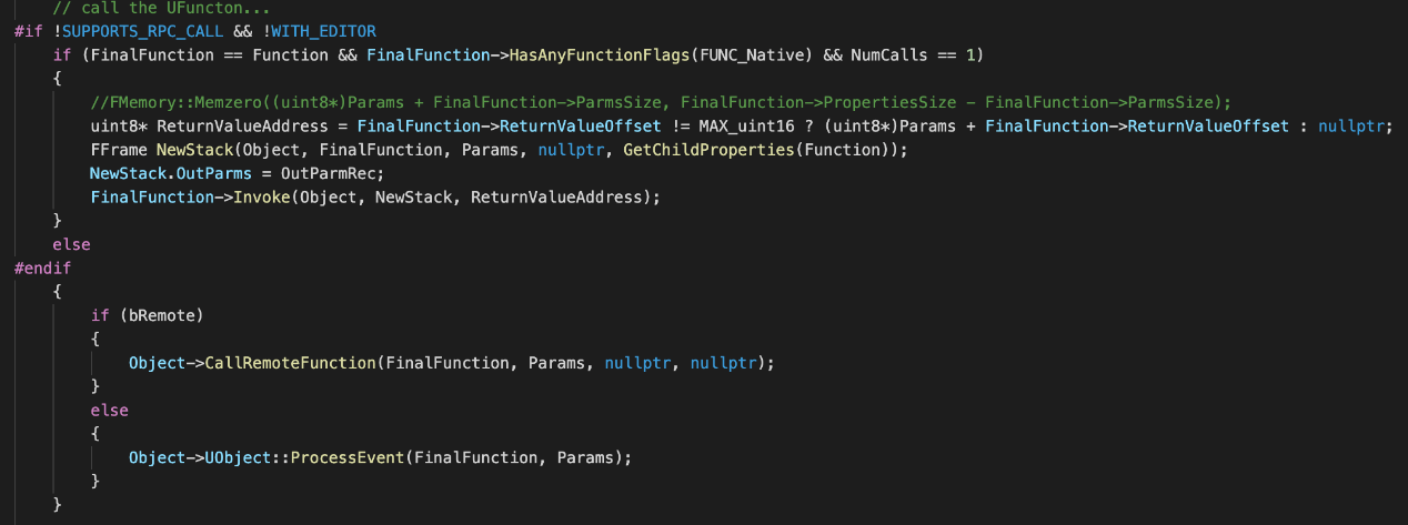 有了函数参数,UFucntion就可以完成反射调用,这里简单说下UE是如何通过UFunction来实现对反射函数的调用的。