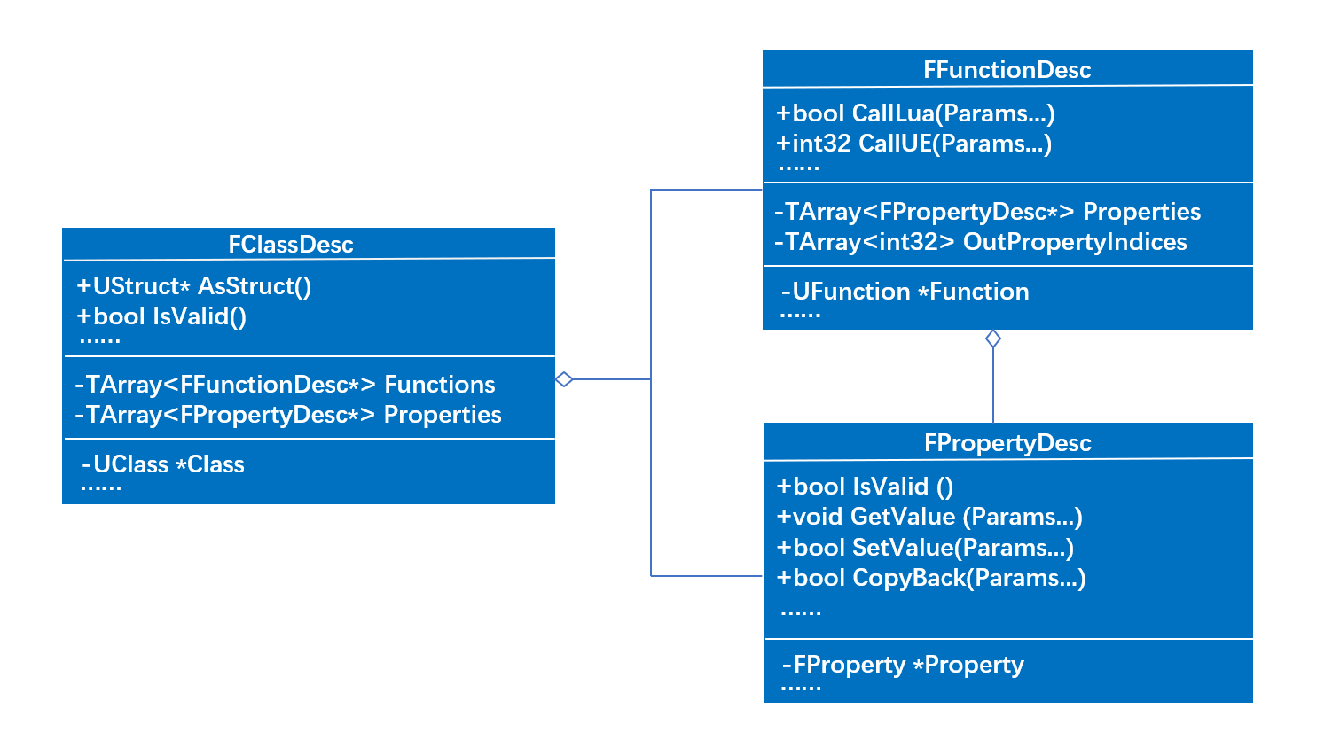 在Lua中可以对C++中对象类型,属性,函数进行无胶水代码进行访问调用,主要依赖了UE4提供的反射机制,然而对UE4反射数据的访问离不开UClass, UScriptStruct, UEnum, UFunction, FProperty等对象,UnLua为了更为方便的对反射数据进行访问处理,对这些反射数据对象以及处理函数进行封装。其中将UClass与UScriptStruct封装为FClassDesc,UEnum为FEnumDesc, UFunction为FFunctionDesc,FProperty为FPropertyDesc,类图如下: