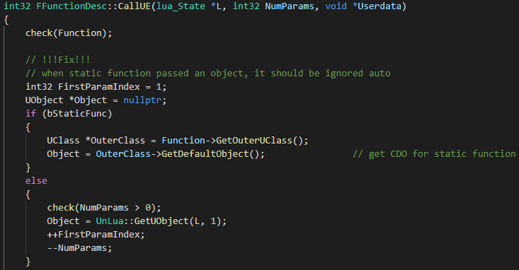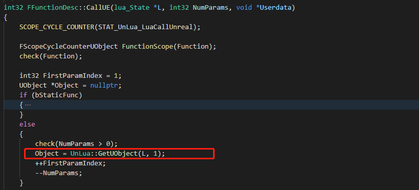 对于非静态函数,根据Lua函数传入参数的第一个参数来获取UObejct对象实例,这个参数可能是一个lua table也可能是一个userdata,后面会对UObject对象实例的访问具体讲解,先了解就好。