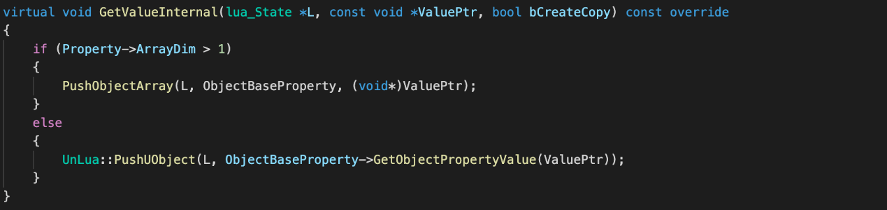 然后就可以根据成员变量的反射信息,成员在UObject对象中的偏移地址,成员属性类型,从UObejct对象指针中获取到成员对应的值,将值压入到Lua栈中,这样就完成了属性访问。(对于基础类型,bool,int,FString等直接简单转换入栈,对于UObject,Struct等结构类型,使用userdata绑定metatable入栈)