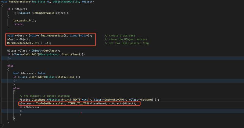 在Lua中新建UObejct对象实例,主要做了两个事情,一是创建了一个userdata,该userdata内存占用为一个指针变量的大小,然后将UObject对象指针存储下来。二是注册该UObject对象类型到Lua中,流程如第一节讲述的一样,先注册FClassDesc反射描述信息,在注册metatable到lua中。然后将该metatable表设置为该userdata的metatable。