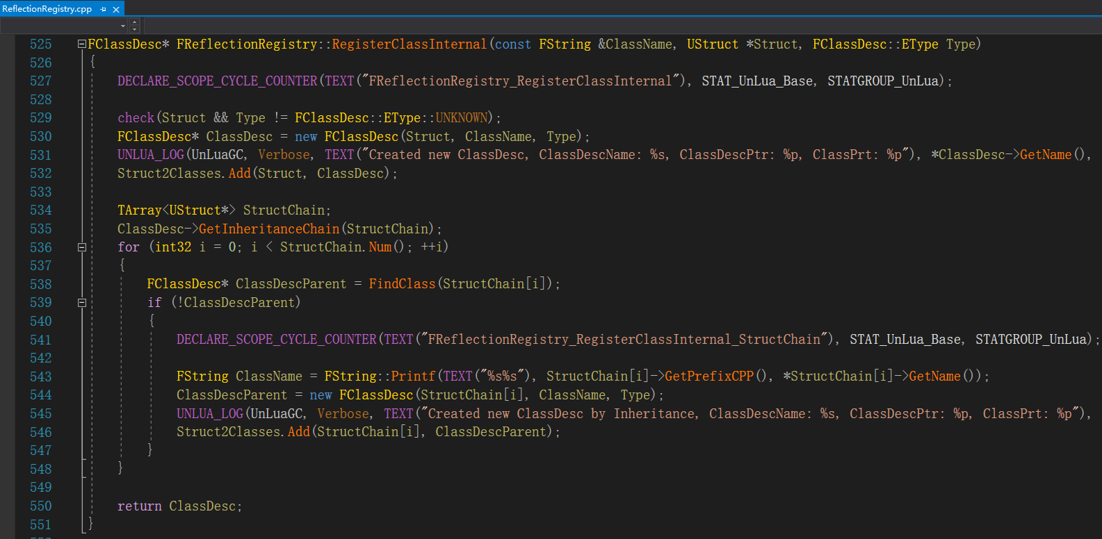 这里又调用了ClassDesc->GetInheritanceChain(StructChain)获取继承链,是循环将该类型的所有父类的UStruct存到一个列表中,然后递归注册父类的FClassDesc,这么做是后面注册该类型的lua metatable表时,需要递归创建父类的metatable,需要用到父类FClassDesc,因此在这里直接提前创建。