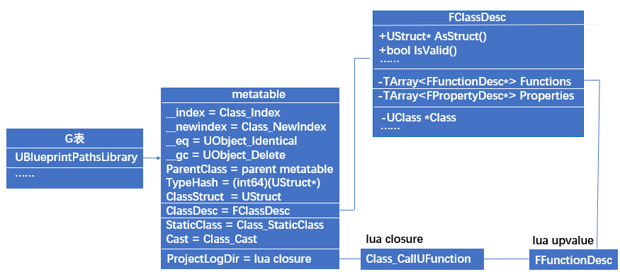 至此,回归到最初我们在Lua中执行UBlueprintPathsLibrary.ProjectLogDir去访问UBlueprintPathsLibrary类型中的ProjectLogDir函数时,我们就可以知道,我们先去名为UBlueprintPathsLibrary的metatable中的找key为ProjectLogDir的成员,如果没有找到触发调用了Class_Index,在UBlueprintPathsLibrary对应的FClassDesc反射数据中去找ProjectLogDir成员,如果没有则注册成员函数的反射数据FFunctionDesc,最后将Class_CallUFunction函数与反射数据FFunctionDesc打包成一个lua closure压入栈中,所以Lua中根据类型去直接访问其成员函数,最终会把一个lua closure压到lua中,后续调用也是在调用该closure。图解: