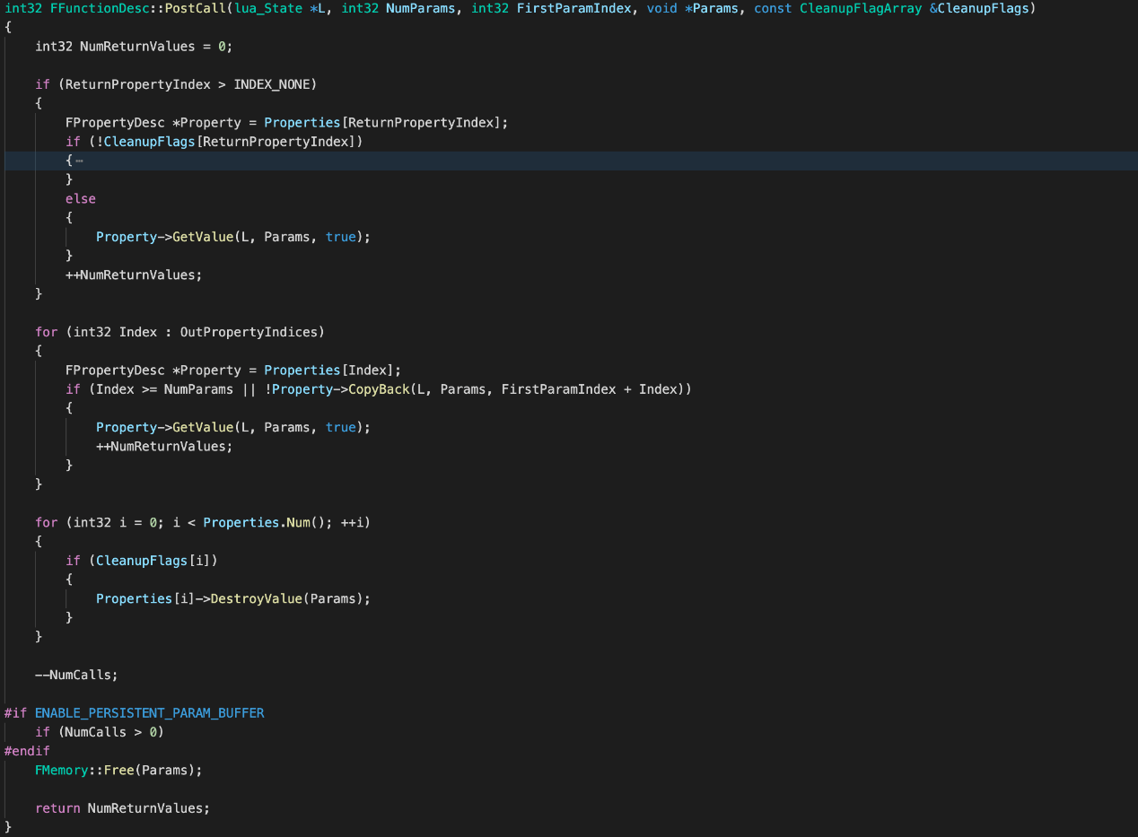 最后,将Params内存中的传入参数进行销毁析构,至此就完成了Lua反射调用UFucntion的整个流程。